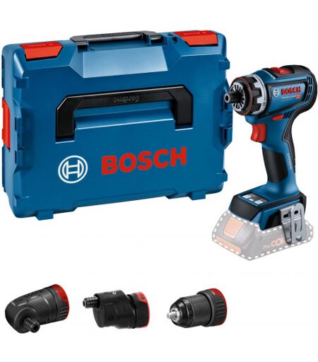 GSR 18V-90 FC Professional : l’assurance d’etre bien équipé pour chaque application professionnelle Le FlexiClick System de Bosch Professional est un systeme polyvalent avec adaptateurs faciles a changer Le GFA 18-H transforme l’outil en un perforateur - il s’agit de la seule perceuse-visseuse 18 V permettant de perforer sans effort dans du béton jusqu’a un O 10 mm Avec une tete courte de seulement 136 mm et un couple maximal de 64 Nm (vissages durs), il constitue un outil a la fois compact et puissant Fonctions et principales caractéristiques Ce produit comprend Mandrin métallique GFA 18-M Professional 1 600 A01 3P6 Mandrin excentré GFA 18-E Professional 1 600 A00 1SJ Renvoi d’angle GFA 18-W Professional 1 600 A01 3P7 L-BOXX 136 1 600 A01 2G0 Calages pour L-BOXX 136 CARACTÉRISTIQUES TECHNIQUES Données les plus importantes Couple (tendre/dur/maxi)* 36/64/- Nm Régime a vide (1ere vitesse / 2eme vitesse)* 0 – 630 / 0 – 2.100 tr/min Type de batterie Lithium-ion Plage de serrage du mandrin, min./max. 1,5 / 13 mm Tension de la batterie 18,0 V Poids sans batterie* 0,92 kg Présélections de couple 21 Dimensions de l’emballage (longueur x largeur x hauteur) 224 x 234 x 94 mm Diametre de perçage O de perçage dans le bois, maxi. 68 mm O de perçage dans l'acier, maxi. 13 mm Diametre de la vis O de vissage maxi. 12 mm GSR 18V-90 FC PROFESSIONAL: INFORMATIONS COMPLÉMENTAIRES Points forts du produit La puissante GSR 18V-90 FC Professional fait partie du FlexiClick System de Bosch Professional conçu pour relever bon nombre de défis sur le chantier : l’adaptateur mandrin excentrique permet de travailler pres des bords et des murs, l’adaptateur renvoi d’angle transforme la perceuse-visseuse en une perceuse d’angle. Ces adaptateurs peuvent etre bloqués dans 16 positions différentes sur 360°, sans avoir a les retirer de l’outil. L’adaptateur perforateur GFA 18-H innovant transforme l’outil en un véritable perforateur SDS plus permettant de perforer sans effort dans du béton jusqu’a un O 10 mm. Avec une tete courte de seulement 136 mm et un couple maximal de 64 Nm (vissages durs), vous avez entre les main un outil a la fois compact et puissant. Le FlexiClick System de Bosch Professional : permet d’etre parfaitement équipé pour les travaux professionnels. Équipement et application Elle est parfaite pour toutes les applications de vissage et perçage dans le bois, le métal et (en combinaison avec l’adaptateur GFA 18-H) le béton, la maçonnerie et la pierre. Informations complémentaires La perceuse-visseuse dispose d’un moteur sans charbon, de 2 vitesses, d’une fonction KickBack Control désactivable, d’un embrayage de précision désactivable, d’une Electronic Motor Protection et d’un pré-équipement Bluetooth®.> ...