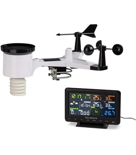 Description générale Ne manquez plus aucun phénomène météorologique grâce à la station météo professionnelle Waldbeck Huygens. Cette station vous permet de suivre toutes les mesures, avertissements et prévisions utiles grâce à un affichage couleur clair. Elle peut afficher jusqu'à 6 mesures simultanément, notamment la température, la pression atmosphérique, les précipitations, la vitesse du vent, le rayonnement UV et la lumière. Alimentée par batterie, la station extérieure est installée à proximité de votre domicile et envoie les données en temps réel à l'appareil de lecture à l'intérieur. Spécifications techniques Affichage couleur clair avec 6 mesures en un coup d'œil Station extérieure alimentée par batterie Interface WiFi avec application gratuite Wunderground Affichage du calendrier et de la phase de lune actuelle Dimensions de l'appareil de lecture : environ 18,7 x 11,9 x 2 cm Dimensions de la station extérieure : environ 40 x 20 x 41,5 cm Poids : environ 0,8 kg Compatibilité ...