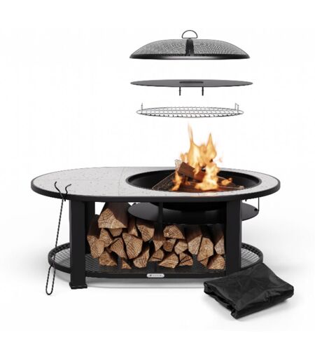 BLUMFELDT Braséro exterieur 3 en 1 - foyer, table, Brasero barbecue gril avec espace rangement bouclier thermique - avec grille, tisonnier, pare-etincelles,