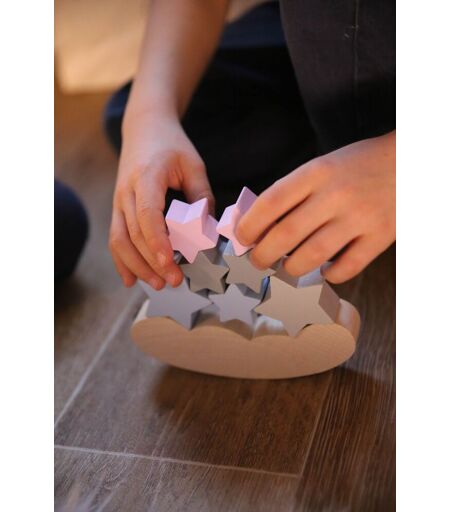 Un jeu d?empilage avec des étoiles pour les enfants à partir de 18 mois. Ciel étoilé est un jeu d'adresse dont le but est d'empiler les étoiles de différentes tailles sur ce nuage arrondi qui vascille. Un jouet en bois de la collection Bellybutton, fabriqué en Allemagne par la marque Selecta. ...