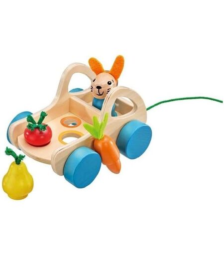 Verdurino, le plus mignon des livreurs ! Le lapin Verdurino conduit un joli véhicule en bois. Une fois les fruits et les légumes bien rangés à leur place, c'est parti pour la livraison ! En tirant sur la ficelle, la tournée commence avec cet adorable petit lapin aux commandes. Il adore les enfants et sera un adorable compagnon de jeu pour accompagner bébé dans ses premiers pas, dès 12 mois. ...
