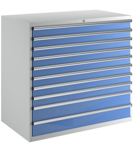 Armoire à tiroirs, hauteur x largeur x profondeur 1200 x 1300 x 750 mm, 10 tiroirs, charge max. par tiroir 80 kg. Produit livré = monté. Hauteur = 1200 mm. Largeur = 1300 mm. Profondeur = 750 mm. Nombre de tiroirs = 10 pces. Hauteur tiroirs = 8 x100, 2x150 mm. Charge max. par tiroir = 80 kg. Ouverture tiroirs = 80%. Glissière de tiroir = glissières télescopiques à galets. Verrouillage = verrouillage central par serrure à cylindre. Equipement = ouverture sélective des tiroirs. Propriété = inscriptions possibles. Matériau = tôle d'acier, peinte époxy. Coloris corps = gris clair RAL 7035. Coloris façade = bleu clair RAL 5012. Dimensions intérieures des tiroirs = 1189x595 mm. Avec serrure à cylindre pour verrouillage central. Anti-basculement grâce aux tiroirs avec sécurité d'ouverture individuelle. Poignée en aluminium sur toute la longueur avec porte-étiquette. Durable et pratique : L'armoire à tiroirs eurokraft pro se distingue par sa construction robuste en tôle d'acier et sa ...