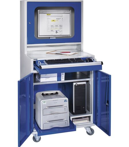 Armoire pour ordinateur, h x l x p 1550 x 800 x 690 mm, avec tablette coulissante étroite et compartiment pour UC verticale. Produit livré = monté. Largeur = 800 mm. Hauteur = 1550 mm. Profondeur = 690 mm. Matériau corps = tôle d'acier, peinte époxy. Dimensions intérieures compartiment pour écrans = h x l x p 530x740x330 mm. Taille max. de l'écran (TFT) = 24 pouces. Coloris corps = gris clair RAL 7035. Coloris façade = bleu gentiane RAL 5010. Dimensions fenêtre = 535x375 mm. Nombre de tablettes coulissantes = 1 pces. Charge max. par tablette coulissante = 50 kg. Nombre de tablettes = 1 pces. Nombre de tiroirs = 1 pces. Aération = ventilateur axial avec filtre anti-poussière. Type de protection = IP50. Propriété = verrouillable. Version = avec tablette coulissante étroite et compartiment pour unité centrale verticale. Type de porte = porte battante. Modèle industriel extrêmement robuste. Énorme espace de rangement pour imprimante, ordinateur, etc., avec tablette coulissante pour ...