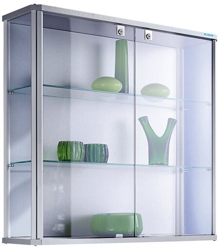 Vitrine murale design, h x l x p 800 x 820 x 250 mm, sans éclairage. Produit livré = démonté. Hauteur = 800 mm. Largeur = 820 mm. Profondeur = 250 mm. Matériau = en verre sécurit. Matériau cadre = aluminium. Coloris cadre = anodisé argent. Nombre de tablettes = 2 pces. Matériau tablettes = en verre sécurit à vitre simple. Epaisseur porte = 4 mm. Type de porte = porte à fenêtre en verre sécurit. Verrouillage = serrure à cylindre avec jeu de 2 clés. Nombre de plateaux = 3 pces. Eclairage = sans éclairage. Epaisseur tablettes = 5 mm. Poids = 26 kg. Nouvelle gamme de vitrines, plusieurs modèles pour tous les goûts et toutes les fonctions possibles. Les bords biseautés donnent à ces vitrines un air spécial. Profilés d'aluminium de qualité anodisé argent. Parois et portes en verre sécurit, épaisseur 4 mm. Tablettes en verre sécurit réglables en continu. Portes maintenues sans charnières et tournant sur un axe vertical en aluminium sur toute la hauteur. Serrure à cylindre avec jeu de 2 clés. ...