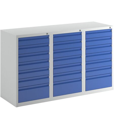 Armoire à tiroirs en acier, h x l x p 900 x 1500 x 500 mm, 21 tiroirs, coloris tiroirs bleu gentiane. Produit livré = monté. Hauteur = 900 mm. Largeur = 1500 mm. Profondeur = 500 mm. Nombre de tiroirs = 21 pces. Hauteur tiroirs = 18x100, 3x200 mm. Charge max. par tiroir = 40 kg. Ouverture tiroirs = 80%. Glissière de tiroir = télescopique. Verrouillage = verrouillage central. Matériau = acier, peint époxy. Coloris corps = gris clair RAL 7035. Coloris façade = bleu gentiane RAL 5010. Dimensions intérieures des tiroirs = 430x450 mm. Rangement structuré avec tiroirs spacieux. Excellent rapport qualité-prix. Construction robuste en acier peint époxy pour une grande longévité. Tiroirs faciles à manipuler pour une ouverture et une fermeture sans effort. Verrouillage central pour sécuriser simultanément les tiroirs. Un maximum d'ordre pour votre atelier avec un excellent rapport qualité-prix : l'armoire à tiroirs eurokraft basic en acier assure un rangement structuré dans les zones de ...