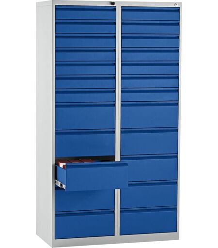 Armoire à tiroirs en acier, h x l x p 1800 x 1000 x 500 mm, 24 tiroirs, coloris tiroirs bleu gentiane. Produit livré = monté. Hauteur = 1800 mm. Largeur = 1000 mm. Profondeur = 500 mm. Nombre de tiroirs = 24 pces. Hauteur tiroirs = 14x100, 10x200 mm. Charge max. par tiroir = 40 kg. Ouverture tiroirs = 80%. Glissière de tiroir = télescopique. Verrouillage = verrouillage central. Matériau = acier, peint époxy. Coloris corps = gris clair RAL 7035. Coloris façade = bleu gentiane RAL 5010. Dimensions intérieures des tiroirs = 430x450 mm. Rangement structuré avec tiroirs spacieux. Excellent rapport qualité-prix. Construction robuste en acier peint époxy pour une grande longévité. Tiroirs faciles à manipuler pour une ouverture et une fermeture sans effort. Verrouillage central pour sécuriser simultanément les tiroirs. Un maximum d'ordre pour votre atelier avec un excellent rapport qualité-prix : l'armoire à tiroirs eurokraft basic en acier assure un rangement structuré dans les zones de ...
