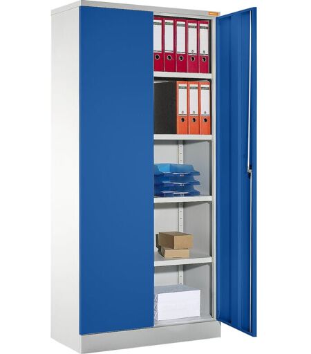 Armoire universelle, h x l x p 1950 x 915 x 421 mm, gris clair / bleu gentiane. Produit livré = démonté. Largeur = 915 mm. Hauteur = 1950 mm. Profondeur = 421 mm. Coloris corps = gris clair RAL 7035. Matériau = tôle d'acier, peinte époxy. Type de produit = armoires à portes battantes. Type de porte = porte battante. Coloris porte = bleu gentiane RAL 5010. Nombre de portes = 2 pces. Nombre de tablettes = 4 pces. Matériau tablettes = tôle d'acier laquée. Coloris tablettes = gris clair RAL 7035. Charge max. par tablette = 50 kg. Propriété = verrouillable. Verrouillage = serrure à cylindre, verrouillage deux points avec jeu de 2 clés. Nombre hauteurs de classeurs = 5 pces. Equipement intérieur = 4 tablettes. Réglage en hauteur des tablettes = 46 mm. Hauteur du socle = 100 mm. Angle d'ouverture des portes = 110 °. Epaisseur tablettes = 0.70 mm. Epaisseur du corps = 0.70 mm. Epaisseur porte = 0.70 mm. Armoires universelles d'un excellent rapport qualité-prix. 4 tablettes laquées gris clair ...
