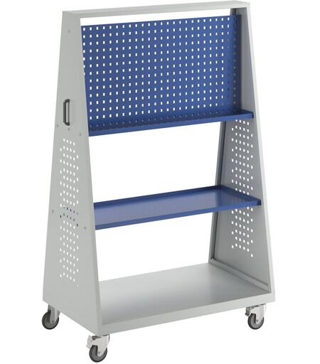 Chariot à outils et d'atelier, 2 plaques perforées, 2 tablettes, L x l x h 1052 x 629 x 1690 mm. Produit livré = démonté. Longueur = 1052 mm. Largeur = 629 mm. Hauteur = 1690 mm. Coloris du piétement = gris clair RAL 7035, bleu gentiane RAL 5010. Matériau du piétement = tôle d'acier, peinte époxy. Nombre de plateaux = 2 pces. Train de roulement = 4 roulettes pivotantes, dont 2 avec blocage. Diamètre roues = 100 mm. Force = 150 kg. Type de produit = chariots/servantes d'atelier. Outils et matériel toujours à portée de mains. Ordre et clarté: idéal pour la mise en œuvre de méthodes LEAN. Accessoires compatibles: porte-outils EUROKRAFT. En tôle d'acier peinte époxy. Piétement gris clair RAL 7035, plaques perforées et tablettes bleu gentiane RAL 5010. Dimensions extérieures Hauteur x largeur 1690 x 1052 mm. Profondeur en haut 153 mm, en bas 629 mm. 4 roulettes pivotantes, dont 2 avec freins. Ø roulettes 100 mm, hauteur h.t. 140 mm. Produits livrés démontés, montage simple. ...