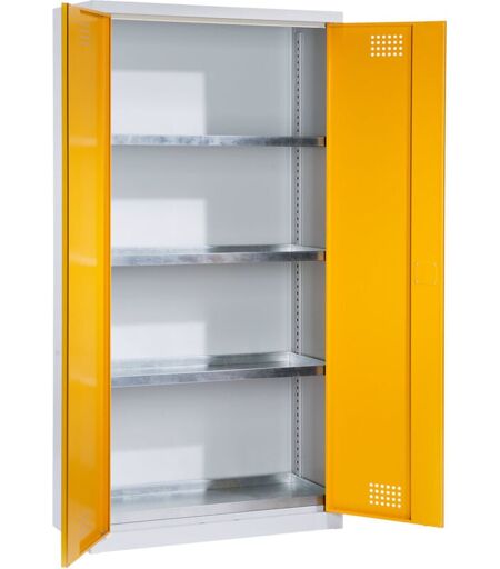 Armoire de sécurité, hauteur 1800 mm, 3 tablettes de rétention, 1 cuve de rétention. Produit livré = monté. Hauteur = 1800 mm. Largeur = 920 mm. Profondeur = 400 mm. Matériau = tôle d'acier. Coloris corps = gris clair RAL 7035. Coloris porte = jaune melon RAL 1028. Nombre de portes = 2 pces. Type de porte = porte battante. Charge max. par tablette = 40 kg. Nombre de niveaux = 4 pces. Verrouillage = serrure à cylindre. Surface = peint époxy. Nombre de tablettes de rétention = 3 pces. Nombre de cuves de rétention de rayonnage = 1 pces. Pas de réglage en hauteur des tablettes de rétention = 25 mm. Tablettes de rétention soudées étanches (sans homologation ÜHP). Pour le stockage intérieur sûr et conforme de bidons contenant des liquides dangereux pour la nappe phréatique. Aération et ventilation efficaces grâce aux perforations dans les portes. Tablettes de type standard et de rétention réglables en hauteur. Portes verrouillables. L'armoire de sécurité eurokraft basic convainc par sa ...