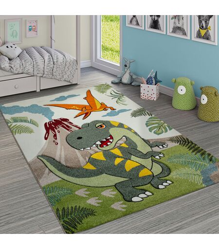 Paco Home - Tapis Chambre Enfant Adorable Dinosaures Jungle Volcan Effet 3-D Poils Ras Vert 120 cm rond