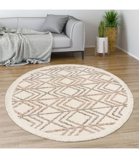 Tapis Salon Chambre Adulte Poils Ras Motif Boho Motif Geometrique Franges 120 cm rond, Crème 3 - Paco Home