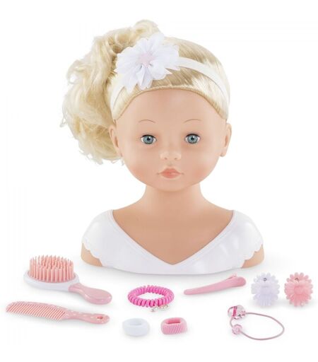 La T?te ? Coiffer poss?de 10 accessoires r?alistes (1 bandeau ?lastique blanc avec 1 fleur, 1 brosse ? cheveux, 1 peigne, 2 pinces ? griffes, 1 pince ? cheveux plate, 1 ?lastique avec un c?ur, 1 ?lastique ? spirale et 2 chouchous) pour cr?er de nombreuses coiffures !. Les cheveux de la t?te ? coiffer sont implant?s de mani?re r?guli?re pour permettre un rendu le plus naturel possible.. La T?te ? Coiffer est en vinyle doux au toucher ? la d?licate senteur de vanille. Les yeux sont fixes avec des cils.. Le Coffret Coiffure Corolle compl?te parfaitement la T?te ? Coiffer pour passer des heures ? imaginer toujours plus de nouvelles coiffures !. Coiffer, c'est jouer. D?s 3 ans. ...