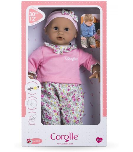 B?b? Calin Maria est un petit poupon de 30cm, la taille parfaitement adapt?e aux petits bras et mains de l'enfant pour le manipuler.. Son corps souple lui permet de prendre les m?mes positions qu'un vrai b?b?. Son visage, ses bras et ses jambes, ? la d?licate senteur de vanille, sont en vinyle doux au toucher. Son pouce peut se maintenir dans sa bouche comme un vrai b?b?. Avec ses yeux marron dormeurs, il fait dodo quand on le couche sur le dos.. Il est habill? d'une tenue 2-en-1 compos?e d'un pantalon fleuri et d'un T-Shirt rose manches longues et coiff? d'un bandeau assorti.. B?b? Calin Maria dispose d'une collection vari?e de v?tements et d'accessoires dans la gamme mon premier poupon Corolle pour pouponner pour la premi?re fois. D?s 18 mois. ...