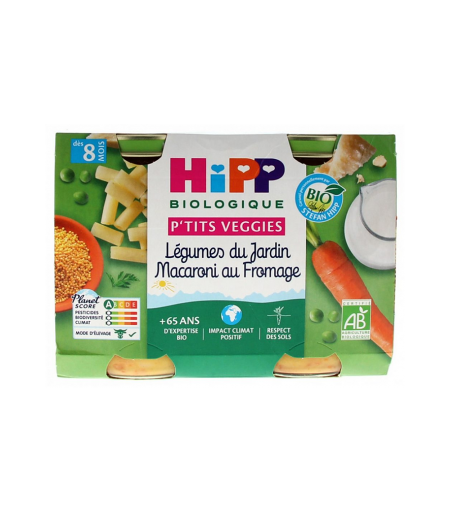 Parapharmacie > Bébé & Maman > Alimentation bébé > Repas bébé HiPP P tits Veggies Légumes du Jardin Macaroni au Fromage dès 8 Mois Bio Pots x 2