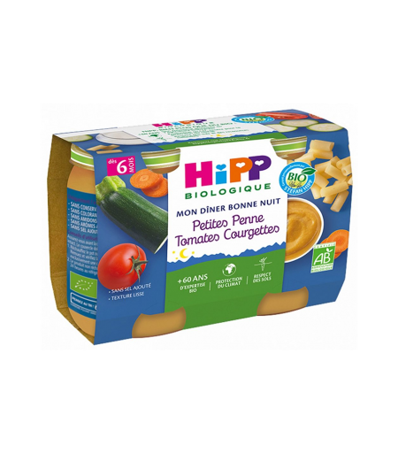Parapharmacie > Bébé & Maman > Alimentation bébé > Repas bébé HiPP Mon Dîner Bonne Nuit Petites Penne Tomates Courgettes dès 6 Mois Bio Pots x 2
