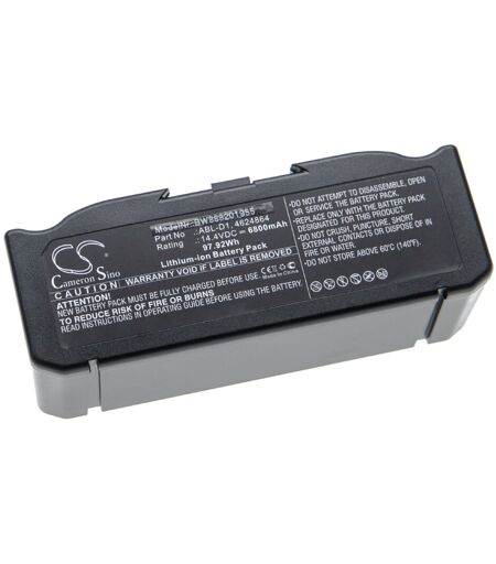 vhbw - the clever way - Batterie de rechange de haute qualité et compatible avec une grande autonomie et compatible avec votre aspirateur robot ou aspirateur robot ainsi qu'appareil de nettoyage (vous trouverez ci-dessous tous les modèles correspondants) - Nos batteries répondent à toutes les normes de sécurité actuelles Pour répandre une odeur fraîche avec votre robot aspirateur ou votre aspirateur, vous pouvez consulter nos offres de cartouches de parfum. CONTENU DE LIVRAISON : - 1x batterie DONNÉES TECHNIQUES : - Technologie : Li-ion - pas d'effet mémoire - Capacité : 6800 mAh - Tension : 14,4 V - Énergie nominale : 97.92 Wh - Couleur : noir - Nombre de cellules : 4 COMPATIBLE AVEC : - iRobot Roomba E6 - iRobot Roomba e5154 - iRobot Roomba e5158 - iRobot Roomba e515840 - iRobot Roomba e6198 - iRobot Roomba e619820 Pour garantir la compatibilité, veuillez vérifier si votre batterie utilisée actuellement est répertoriée. REMPLACEMENT POUR : - iRobot ABL-D2, ABL-D1, 4624864 vhbw - Accessoires et pièces de rechange de haute qualité. Pour une longue durée de vie de vos appareils électriques. ...