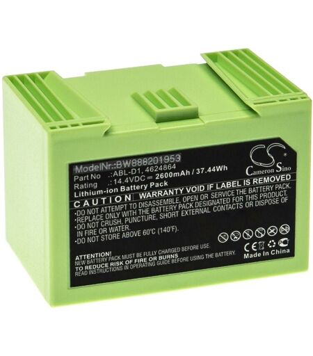vhbw - the clever way - Batterie de rechange de haute qualité et compatible avec une grande autonomie et compatible avec votre aspirateur robot ou aspirateur robot ainsi qu'appareil de nettoyage (vous trouverez ci-dessous tous les modèles correspondants) - La batterie peut être chargée avec le chargeur standard ou un chargeur compatible - Nos batteries répondent à toutes les normes de sécurité actuelles Pour répandre une odeur fraîche avec votre robot aspirateur ou votre aspirateur, vous pouvez consulter nos offres de cartouches de parfum. CONTENU DE LIVRAISON : - 1x batterie DONNÉES TECHNIQUES : - Technologie : Li-ion - pas d'effet mémoire - Capacité : 2600 mAh - Tension : 14,4 V - Énergie nominale : 37,44 Wh - Couleur : noir - Nombre de cellules : 4 - Poids : 250 g COMPATIBLE AVEC iRobot Roomba i517840, i455840, i355840, i517640, i517240, i4558 Pour garantir la compatibilité, veuillez vérifier si votre batterie utilisée actuellement est répertoriée. REMPLACEMENT POUR : - 4624864, ...