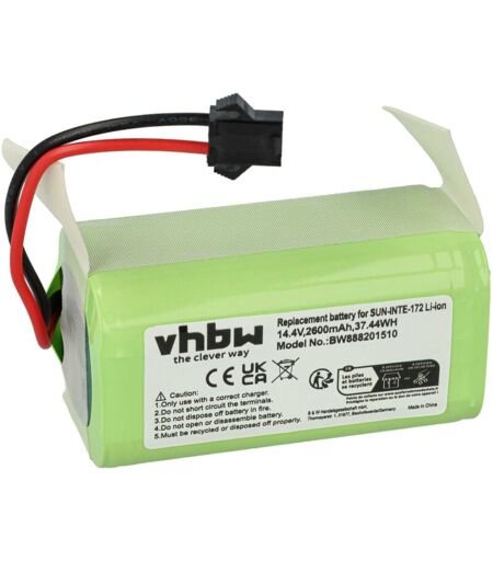vhbw - the clever way - Batterie de rechange de haute qualité et compatible avec une grande autonomie et compatible avec votre aspirateur robot ou aspirateur robot ainsi qu'appareil de nettoyage (vous trouverez ci-dessous tous les modèles correspondants) - La batterie peut être chargée avec le chargeur standard ou un chargeur compatible - Nos batteries répondent à toutes les normes de sécurité actuelles Pour répandre une odeur fraîche avec votre robot aspirateur ou votre aspirateur, vous pouvez consulter nos offres de cartouches de parfum. CONTENU DE LIVRAISON : - 1x batterie DONNÉES TECHNIQUES : - Technologie : Li-ion - pas d'effet mémoire - Capacité : 2600 mAh - Tension : 14,8 V - Énergie nominale : 38,48 Wh - Nombre de cellules : 4 - Poids : 192 g COMPATIBLE AVEC Ecovacs Deebot CEN546, D502, D501, D500, 715, DN79S, D711, D710, D600 Pour garantir la compatibilité, veuillez vérifier si votre batterie utilisée actuellement est répertoriée. REMPLACEMENT POUR : - BFG-WSQ, ...