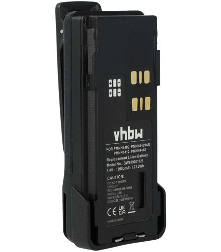 vhbw - the clever way - Batterie de rechange de haute qualité avec une grande autonomie et compatible avec votre radio talkie-walkie (vous trouverez ci-dessous tous les modèles correspondants) - La batterie peut être chargée avec le chargeur standard ou un chargeur compatible - Nos batteries répondent à toutes les normes de sécurité actuelles CONTENU DE LIVRAISON : - 1x batterie avec clip de ceinture DONNÉES TECHNIQUES : - Technologie : Li-ion - sans effet mémoire - Capacité : 3000 mAh - Tension : 7,4 V - Énergie nominale : 22,2 Wh - Nombre de cellules : 2 - Poids : 153 g - Dimensions (L x l x H): 11,9 x 5,5 x 4,1 cm - Protection contre les courts-circuits, la surcharge et la surchauffe COMPATIBLE AVEC Motorola P8608, GP328D, P8668i, TRBO, P8660 Pour garantir la compatibilité, veuillez vérifier si votre batterie utilisée actuellement est répertoriée. REMPLACEMENT POUR : - PMNN4406, PMNN4406BR, PMNN4409, PMNN4409AR, PMNN4409BR, PMNN4412, PMNN4448, PMNN4489A, PMNN4490, PMNN4490A, PMNN4490B, PMNN4491, PMNN4491B, PMNN4493, PMNN4543, PMNN4543A, PMNN4544, PMNN4544A vhbw - Accessoires et pièces de rechange de haute qualité pour prolonger la durée de vie de vos appareils électriques. ...
