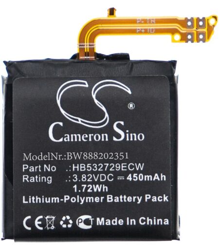 vhbw - the clever way - Batterie de rechange de haute qualité et compatible avec une grande autonomie et compatible avec votre montre connectée smartwatch ainsi que pour votre bracelet fitness (vous trouverez ci-dessous tous les modèles correspondants) - Nos batteries répondent à toutes les normes de sécurité actuelles CONTENU DE LIVRAISON : - 1x batterie DONNÉES TECHNIQUES : - Technologie : Li-polymère - Capacité : 450 mAh - Tension : 3,82 V - Énergie nominale : 1,72 Wh - Nombre de cellules : 1 COMPATIBLE AVEC : - Huawei GT2 46mm - Huawei MNS-B19 - Huawei Magic Watch 2 46mm Pour garantir la compatibilité, veuillez vérifier si votre batterie utilisée actuellement est répertoriée. REMPLACEMENT POUR : - Huawei HB532729ECW vhbw - Accessoires et pièces de rechange de haute qualité pour prolonger la durée de vie de vos appareils électriques. ...