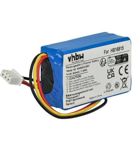 vhbw - the clever way - Batterie de rechange de haute qualité et compatible avec une grande autonomie et compatible avec votre robot nettoyeur de vitres ou aspirateur robot ainsi qu'appareil de nettoyage (vous trouverez ci-dessous tous les modèles correspondants) - Nos batteries répondent à toutes les normes de sécurité actuelles CONTENU DE LIVRAISON : - 1x batterie DONNÉES TECHNIQUES : - Technologie : Li-ion - pas d'effet mémoire - Capacité : 800 mAh - Tension : 14,8 V - Énergie nominale : 11,84 Wh - Nombre de cellules : 4 COMPATIBLE AVEC : - Hobot 168 - Hobot 188 - Hobot 198 - Hobot 268 - Hobot 288 Pour garantir la compatibilité, veuillez vérifier si votre batterie utilisée actuellement est répertoriée. REMPLACEMENT POUR : - Hobot HB16815 vhbw - Accessoires et pièces de rechange de haute qualité. Pour une longue durée de vie de vos appareils électriques. ...