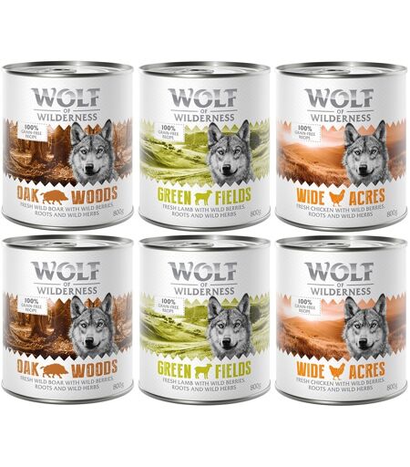 Lot mixte Wolf of Wilderness Adult pour chien - 6 x 800 g: agneau, sanglier, poulet