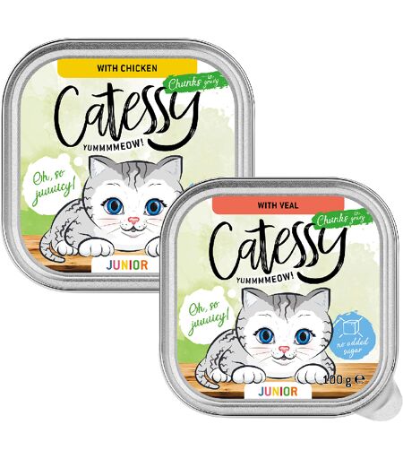 Des économies même pour les plus petits ! Catessy gâte vos chatons avec les bouchées à la viande en sauce Junior. Ce mélange de 2 variétés est parfaitement adapté aux besoins des chatons âgés de 7 semaines à 12 mois et offre tout ce que vous et... ...