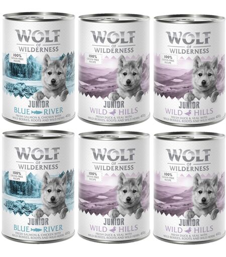 Little Wolf of Wilderness 6 x 400 g pour chiot - Lot mixte Junior : 4 x canard & veau, 2 x poulet & saumon