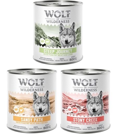 Wolf of Wilderness Adult “Expedition” 6 x 800 g pour chien - lot mixte : Stony Creek, Sandy Path, Steep Journey