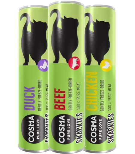 Testez-les : Cosma Snackies Friandises lyophilisées pour chat - 46 g, 3 saveurs (poulet, canard, bœuf)