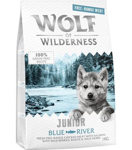 Caractéristiques des croquettes Wolf of Wilderness JUNIOR Blue River poulet élevé en liberté saumon pour chiot : s'inspirent de l'alimentation naturelle du loup à l'état sauvage : pour les chiens adultes de toutes les races et tailles recette 100... ...