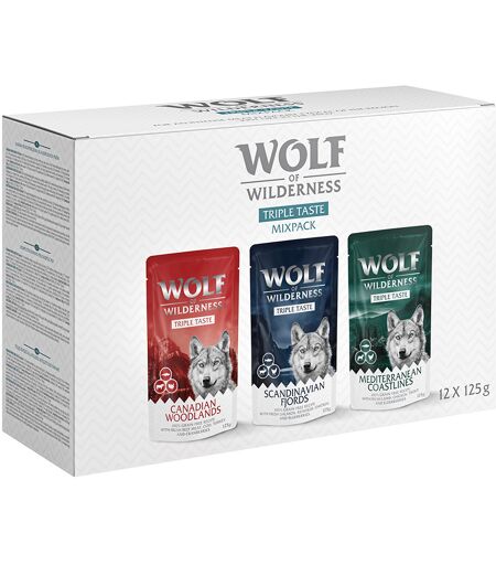 Wolf of Wilderness "Triple Taste" 12 x 125 g pour chien Lot mixte : Canadian Woodlands, Scandinavian Fjords, Mediterranean Coastlines