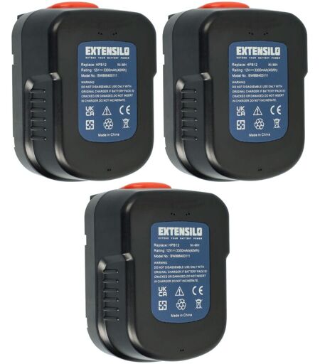 VHBW EXTENSILO 3x Batteries compatible avec Black & Decker BD12PSK, BDBN1202, BDG1200K, BDGL12K, B-8315 outil électrique (3300 mAh, NiMH, 12 V)