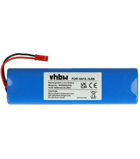 vhbw - the clever way - Batterie de rechange de haute qualité et compatible avec une grande autonomie et compatible avec votre aspirateur robot ou aspirateur robot ainsi qu'appareil de nettoyage (vous trouverez ci-dessous tous les modèles correspondants) - Nos batteries répondent à toutes les normes de sécurité actuelles Pour répandre une odeur fraîche avec votre robot aspirateur ou votre aspirateur, vous pouvez consulter nos offres de cartouches de parfum. CONTENU DE LIVRAISON : - 1x batterie DONNÉES TECHNIQUES : - Technologie : Li-ion - pas d'effet mémoire - Capacité : 3000 mAh - Tension : 14,4 V - Énergie nominale : 43,2 Wh - Nombre de cellules : 4 - Poids : 200 g - Dimensions (L x l x H): 13,2 x 3,7 x 2,1 cm COMPATIBLE AVEC : - Zaco V3 - Zaco V40 - Zaco V5s Pro - Zaco V5x Pour garantir la compatibilité, veuillez vérifier si votre batterie utilisée actuellement est répertoriée. REMPLACEMENT POUR : - 18650B4-4S1P-AGX-2, SUN-INTE-202 vhbw - Accessoires et pièces de rechange de haute qualité pour prolonger la durée de vie de vos appareils électriques. ...