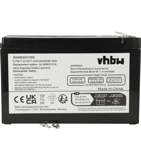 vhbw - the clever way - Batterie de rechange de haute qualité avec une grande autonomie et compatible avec votre outil de jardinage (vous trouverez ci-dessous tous les modèles correspondants) - La batterie peut être chargée avec le votre chargeur standard ou un chargeur compatible - Nos batteries répondent à toutes les normes de sécurité actuelles CONTENU DE LIVRAISON : - 1x batterie DONNÉES TECHNIQUES : - Technologie : acideplomb scellé - Capacité : 7200 mAh - Tension : 12 V - Énergie nominale : 86,4 Wh - Nombre de cellules : 4 - Poids : 2400 g - Dimensions (L x l x H): 15 x 10 x 6,6 cm Pour garantir la compatibilité, veuillez vérifier si votre batterie utilisée actuellement est répertoriée. REMPLACEMENT POUR : - Robomow BAT9000A, MRK9101A vhbw - Accessoires et pièces de rechange de haute qualité pour prolonger la durée de vie de vos appareils électriques. ...