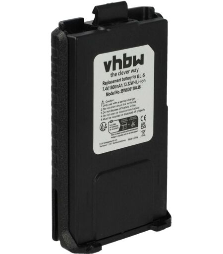 vhbw - the clever way - Batterie de rechange de haute qualité avec une grande autonomie et compatible avec votre radio talkie-walkie (vous trouverez ci-dessous tous les modèles correspondants) - La batterie peut être chargée avec le chargeur standard ou un chargeur compatible - Du fait de cette grande capacité, un autre boîtier de protection est nécessaire - celui-ci est bien entendu inclus dans la livraison - Nos batteries répondent à toutes les normes de sécurité actuelles CONTENU DE LIVRAISON : - 1x batterie avec couvercle de fermeture (couleur : noir) DONNÉES TECHNIQUES : - Technologie : Li-ion - sans effet mémoire - Capacité : 1800 mAh - Tension : 7,4 V - Énergie nominale : 13,32 Wh - Couleur de la couvercle : noir COMPATIBLE AVEC : - TYT TH-F8 - TYT TH-F9 Pour garantir la compatibilité, veuillez vérifier si votre batterie utilisée actuellement est répertoriée. REMPLACEMENT POUR : - BL-5 vhbw - Accessoires et pièces de rechange de haute qualité pour prolonger la durée de vie de ...
