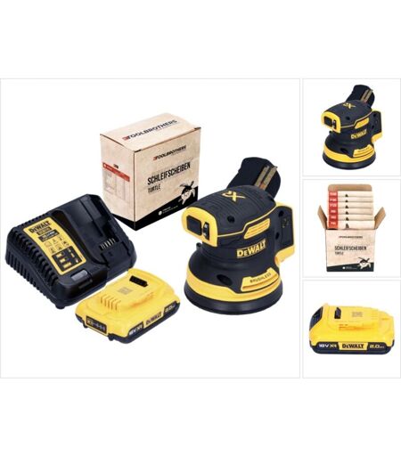 Contenu de la livraison: - 1x DeWalt DCW 210 Ponceuse excentrique sans fil - 1x Dewalt DCB 183 Batterie 18 V 2,0 Ah - 1x Dewalt DCB XR chargeur pour batteries 10,8 - 18 V Li-Ion - 1x Toolbrothers TURTLE set de disques de ponçage 125 mm - composé de : - 10x Toolbrothers TURTLE 125 mm P40 - 10x Toolbrothers TURTLE 125 mm P60 - 10x Toolbrothers TURTLE 125 mm P80 - 10x Toolbrothers TURTLE 125 mm P120 - 10x Toolbrothers TURTLE 125 mm P180 - 10x Toolbrothers TURTLE 125 mm P240 Description du produit: La ponceuse multi-usages FlexVolt XR DeWALT est l'outil parfait pour un travail adapté aux matériaux et un résultat de ponçage optimal. Grâce au démarrage électronique en douceur et au maintien d'une vitesse constante, vous pouvez effectuer votre travail avec précision et en toute sécurité. Le système Performe & Protect assure un équilibre parfait de l'entraînement, un amortissement maximal des vibrations et une longue durée de vie. L'interrupteur et les paliers d'engrenage sont protégés par ...