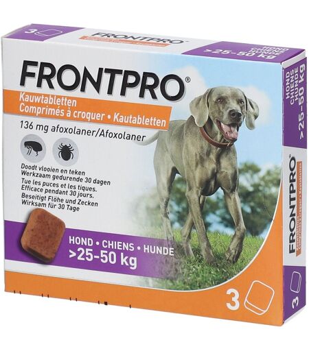 FRONTPRO® Comprimés à Croquer pour Chiens 25-50 kgFRONTPRO 136 mg comprimés à croquer pour chiens >25–50 kg (afoxolaner 136 mg).IndicationChez les chiens, traitement des infestations par les puces (Ctenocephalides felis et C. canis) pendant au moins 5 semaines. Le produit peut être intégré à une stratégie de traitement pour le contrôle de la dermatite par allergie aux piqûres de puces (DAPP).Chez les chiens, traitement des infestations par les tiques (Dermacentor reticulatus, Ixodes ricinus, Rhipicephalus sanguineus). Un traitement élimine les tiques jusqu’à un mois.Les puces et les tiques doivent s’attacher à l’hôte et commencer leur repas pour être exposés à la substance active.Traitement de la démodécie (due à Demodex canis).Traitement de la gale sarcoptique (due à Sarcoptes scabiei var. canis). ...