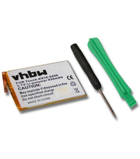 vhbw - the clever way - Batterie de rechange de haute qualité avec une grande autonomie et compatible avec votre lecteur de musique MP3 ou lecteur de vidéo (vous trouverez ci-dessous tous les modèles correspondants) - La batterie peut être chargée avec le chargeur standard ou un chargeur compatible - Les outils nécessaires sont inclus dans la livraison - Nos batteries répondent à toutes les normes de sécurité actuelles CONTENU DE LIVRAISON : - 1x batterie - 1x set d'outils DONNÉES TECHNIQUES : - Technologie : Li-polymère - Capacité : 930 mAh - Tension : 3,7 V - Énergie nominale : 3,44 Wh - Hauteur : environ 0,4 mm - Nombre de cellules : 1 - Poids : 23 g Pour garantir la compatibilité, veuillez vérifier si votre batterie utilisée actuellement est répertoriée. REMPLACEMENT POUR : - Apple GB-S10-314363-0100, 616-0551, 616-0552, 616-0550 vhbw - Accessoires et pièces de rechange de haute qualité pour prolonger la durée de vie de vos appareils électriques. ...