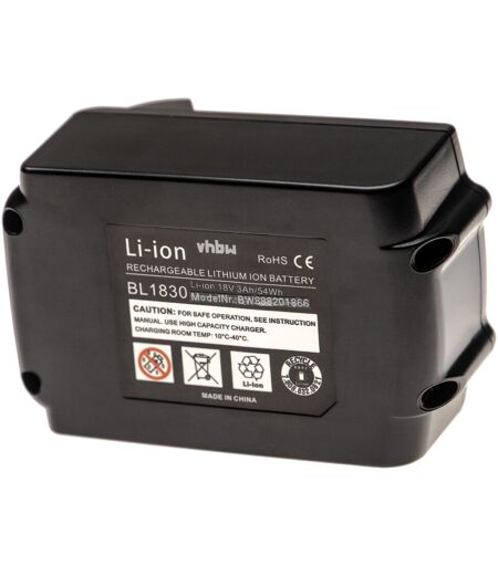 vhbw - the clever way - Batterie de rechange de haute qualité et compatible avec une grande autonomie pour votre outil électrique comme votre perceuse, marteau piqueur, ponceuse, tournevis, outil de cerclage ainsi que votre radio, scie à main et taille-bordures - Cette batterie est aussi idéale comme deuxième batterie - Nos batteries respectent toutes les normes légales Accessoire compatible de haute perfomance de la marque vhbw. CONTENU DE LIVRAISON : - 1x batterie DONNÉES TECHNIQUES : - Poids : 596 g - Technologie : Li-ion - sans effet-mémoire - Capacité : 3000 mAh - Tension : 18 V - Énergie nominale : 54 Wh - Couleur : noir - Nombre de cellules : 10 COMPATIBLE AVEC : - Makita DCU180Z - Makita DCL501 - Makita DDA350RTJ - Makita DCL500Z - Makita DCL501Z - Makita DCO180ZJ - Makita DCU180 Pour garantir la compatibilité, veuillez vérifier si votre batterie utilisée actuellement est répertoriée. REMPLACEMENT POUR : - 194204-5, 194205-3, 194230-4, 194309-1, 197265-04, 197265-4, 197422-4, BL1815, BL1820, BL1820B, BL1830, BL1830B, BL1835, BL1840, BL1840B, BL1845, BL1850, BL1850B, BL1860, BL1860B, BL1890, BL1890B, LXT400, XRU02Z, 197254-9, BL1815B vhbw - Accessoires et pièces de rechange de haute qualité pour prolonger la durée de vie de vos appareils électriques. ...