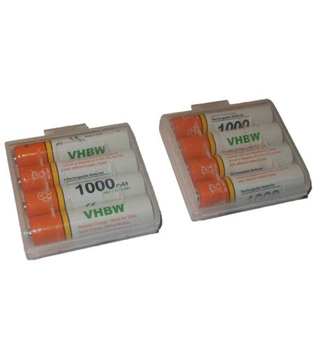 vhbw - the clever way - Batterie de rechange de haute qualité avec une grande autonomie et compatible avec votre téléphone (vous trouverez ci-dessous tous les modèles correspondants) - Cette batterie est livrée avec une boite de transport pratique - Nos batteries répondent à toutes les normes de sécurité actuelles CONTENU DE LIVRAISON : - 8x batterie incl. boite de transport DONNÉES TECHNIQUES : - Technologie : NiMH - Capacité : 1000 mAh - Tension : 1,2 V - Énergie nominale : 1,2 Wh - Couleur : orange / blanc - Désignation de type : AAA micro / R3 / HR03 COMPATIBLE AVEC : - Snom M15 - Snom M25 - Snom M25 IP vhbw - Accessoires et pièces de rechange de haute qualité. Pour une longue durée de vie de vos appareils électriques. ...