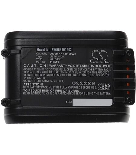 vhbw - the clever way - Batterie de rechange de haute qualité et compatible avec une grande autonomie pour votre outil comme votre perceuse, marteau piqueur, ponceuse, tournevis, outil de cerclage ainsi que votre radio, scie à main et taille-bordures - Nos batteries respectent toutes les normes légales Accessoire compatible de haute perfomance de la marque vhbw. CONTENU DE LIVRAISON : - 1x batterie DONNÉES TECHNIQUES : - Technologie : Li-ion- pas d'effet-mémoire - Capacité : 2000 mAh - Tension : 20 V - Énergie nominale : 40 Wh - Couleur : noir - Nombre de cellules : 6 COMPATIBLE AVEC : - AL-KO Easy Flex HT 2050 Hedge Trimmer - AL-KO Easy Flex HTA 2050 Pour garantir la compatibilité, veuillez vérifier si votre batterie utilisée actuellement est répertoriée. REMPLACEMENT POUR : - AL-KO B50, Easy Flex B50, 113559 vhbw - Accessoires et pièces de rechange de haute qualité pour une longue durée de vie de vos appareils électriques. ...