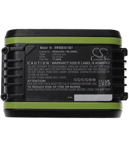 vhbw - the clever way - Batterie de rechange de haute qualité et compatible avec une grande autonomie pour votre outil comme votre perceuse, marteau piqueur, ponceuse, tournevis, outil de cerclage ainsi que votre radio, scie à main et taille-bordures - Nos batteries respectent toutes les normes légales Accessoire compatible de haute perfomance de la marque vhbw. CONTENU DE LIVRAISON : - 1x batterie DONNÉES TECHNIQUES : - Technologie : Li-ion- pas d'effet-mémoire - Capacité : 4950 mAh - Tension : 20 V - Énergie nominale : 99 Wh - Couleur : noir / vert - Nombre de cellules : 6 COMPATIBLE AVEC : - AL-KO Easy Flex HT 2050 Hedge Trimmer - AL-KO Easy Flex HTA 2050 Pour garantir la compatibilité, veuillez vérifier si votre batterie utilisée actuellement est répertoriée. REMPLACEMENT POUR : - AL-KO B100, Easy Flex B100, 113698 vhbw - Accessoires et pièces de rechange de haute qualité pour une longue durée de vie de vos appareils électriques. ...
