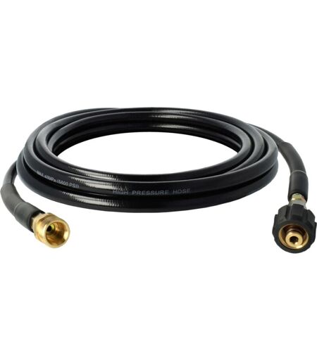 vhbw - the clever way Tuyau de rallonge robuste pour votre nettoyeur haute pression Avec cette rallonge de tuyau pour votre nettoyeur haute pression, vous êtes encore plus flexible pour le nettoyage et les travaux d'extérieur. Si votre tuyau haute pression actuel est trop court pour une utilisation confortable de votre nettoyeur haute pression, cette rallonge de tuyau est parfaite pour vous. Vous pouvez très facilement raccorder le tuyau de rallonge directement à l'appareil à l'aide du raccord manuel et le visser à l'autre extrémité au tuyau existant. La finition de haute qualité des raccords de tuyau assure une fixation sûre à votre nettoyeur haute pression et au tuyau. CONTENU DE LIVRAISON : - 1x tuyau de rallonge (3 m) DONNÉES TECHNIQUES : - Matériau : plastique avec insert en tissu - Couleur : noir - Type de montage : filetage - Connexions : filetage extérieur M22 x 1,5, filetage intérieur M22 x 1,5 - Diamètre nominal (intérieur) : 6 mm - Longueur : 3 m - Poids : 450 g - Pression ...