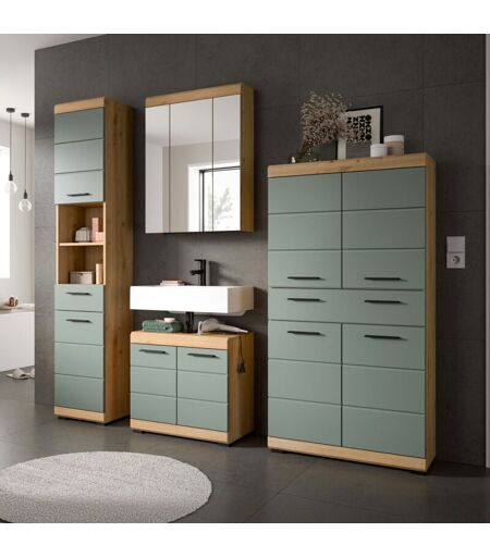 M&S Armoire de toilette + 3 meubles chêne brun et kaki - OLBO