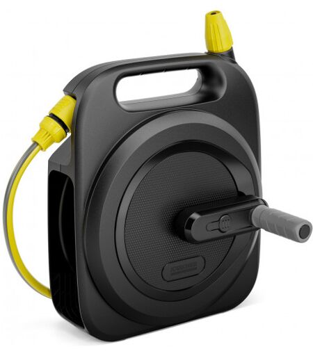 Le dévidoir compact HBX 2.10 est la solution parfaite pour arroser ou nettoyer tous les types de petites surfaces extérieures type balcon, terrasses ou par exemple lors d'une activité extérieure comme le camping. Il est équipé d'un tuyau d'arrosage de 10 metres de diametre 8 mm (5/16''), d'une lance d'arrosage simple, de deux raccords d'arrosage avec Aqua stop et un adaptateur pour nez de robinets G 1 ' 1/2 et G 1' 3/4. Grâce au concept de rangement intelligent pour les accessoires et les déclencheurs de tuyau, les traces d'eau sur les tapis ou les parquets appartiennent désormais au passé. Grâce a ses dimensions compactes, le boîtier peut etre rangé dans les espaces les plus restreints a l'intérieur, par exemple dans le placard sous l'évier de la cuisine. La boîte peut également etre fixée au mur. La boîte a tuyaux convient également comme tuyau d'alimentation pour les nettoyeurs haute pression K 2-K 4 de Kärcher. Caractéristiques et avantages Dévidoir portable compact• Rangement peu encombrant, meme dans les placards sous l'évier. Manivelle repliable• Stockage peu encombrant et enroulement facile. Pret a l'emploi• Tous les accessoires nécessaires pour l'installation a l'extérieur (buse, connecteurs, raccordement au robinet extérieur) sont inclus dans la fourniture. Systeme de rangement astucieux pour les accessoires et les déclencheurs de tuyaux Prévient les traces d'eau sur les moquettes ou les parquets. Tous les accessoires sont rangés en toute sécurité dans la boîte elle-meme pour économiser de l'espace. Deux raccords de tuyau avec Aqua Stop Déconnexion facile sans éclaboussures d'eau. Convient pour une installation murale Des points d'accroche sont prévus a l'arriere du boîtier pour une installation murale. Léger Facile a transporter et ménageant le dos. Possibilités multiples de positionnement du tuyau d'alimentation Évite les plis dans le tuyau pour un débit d'eau constant et une longue durée de vie. Support solide et stable Se déroule facilement, meme en déplacement. Poignée ergonomique Prise en main et transport faciles Données techniques Longueur de flexible (m) 10 Diametre du tuyau 5/16” Capacité de tuyau (m) 10 (5/16") Flexible de raccordement (m) 2 (5/16") Pression de rupture (bar) 24 Couleur Noir Poids (kg) 2,5 Poids avec emballage (kg) 2,8 Dimensions (L × l × H) (mm) 225 x 360 x 387 Lors du raccordement de ces produits au réseau d'eau potable, vous devez respecter les exigences de la norme EN 1717. Si nécessaire, demandez a un professionnel. Inclus dans la livraison Raccord de flexible avec Aqua Stop: 2 Piece(s) Nez de robinet G3/4 avec réducteur G1/2: 1 Piece(s) Arroseur: 1 Piece(s) Flexible 5/16": 10 m Flexible de raccordement 5/16": 2 m Équipement Jet conique Jet crayon Vis et chevilles pour le montage mural> ...