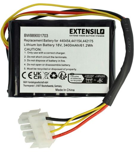 - Batterie de rechange de haute qualité avec une grande autonomie et compatible avec votre outil de jardinage (vous trouverez ci-dessous tous les modèles correspondants) - La batterie peut être chargée avec le chargeur standard ou un chargeur compatible - Nos batteries répondent à toutes les normes de sécurité actuelles CONTENU DE LIVRAISON : - 1x batterie DONNÉES TECHNIQUES : - Technologie : Li-ion - sans effet mémoire - Capacité : 3400 mAh - Tension : 18 V - Énergie nominale : 61,2 Wh - Nombre de cellules : 5 COMPATIBLE AVEC : - AL-KO Solo Robolinho 1000 - AL-KO Solo Robolinho 700 - AL-KO Solo Robolinho 700E - AL-KO Solo Robolinho 1100 Pour garantir la compatibilité, veuillez vérifier si votre batterie utilisée actuellement est répertoriée. REMPLACEMENT POUR : - Alko 440454, 440629, 441154, 442175, 442196, 442632 Batteries Premium de la marque EXTENSILO pour les exigences les plus élevées. Nos batteries de rechange ont été développées pour de hautes performances et une durée de vie ...