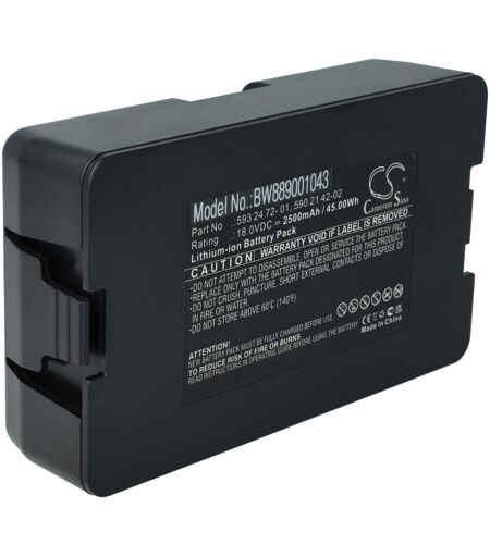 vhbw - the clever way - Batterie de rechange de haute qualité et compatible avec une grande autonomie pour votre outil électrique comme votre perceuse, marteau piqueur, ponceuse, tournevis, outil de cerclage ainsi que votre radio, scie à main et taille-bordures - Cette batterie est aussi idéale comme deuxième batterie - Nos batteries respectent toutes les normes légales Accessoire compatible de haute perfomance de la marque vhbw. CONTENU DE LIVRAISON : - 1x batterie DONNÉES TECHNIQUES : - Technologie : Li-ion - sans effet-mémoire - Capacité : 2500 mAh - Tension : 18 V - Énergie nominale : 45 Wh - Nombre de cellules : 5 Pour garantir la compatibilité, veuillez vérifier si votre batterie utilisée actuellement est répertoriée. REMPLACEMENT POUR : - Flymo 593 24 72-01, 5931141-06, 5931141-0X, 5932472-01 vhbw - Accessoires et pièces de rechange de haute qualité pour prolonger la durée de vie de vos appareils électriques. ...