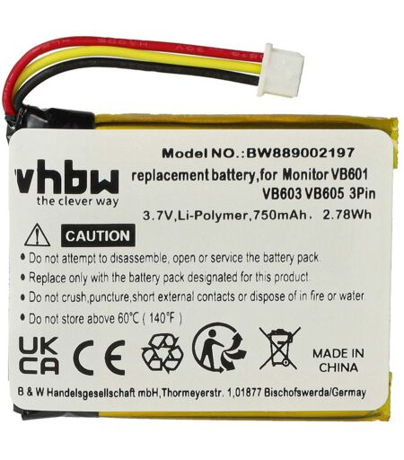 vhbw - the clever way - Batterie de rechange de haute qualité avec une grande autonomie et compatible avec votre babyphone (vous trouverez ci-dessous tous les modèles correspondants) - La batterie peut être chargée avec le chargeur standard ou un chargeur compatible - Nos batteries répondent à toutes les normes de sécurité actuelles CONTENU DE LIVRAISON : - 1x batterie DONNÉES TECHNIQUES : - Technologie : Li-polymère - Capacité : 750 mAh - Tension : 3,7 V - Énergie nominale : 2,78 Wh - Hauteur : environ 0,5 mm - Nombre de cellules : 1 - Poids : 13 g - Nombre de Pins : 3 - Dimensions (L x l x H) : 3,7 x 3,3 x 0,5 cm - Protection contre les courts-circuits, la surcharge et la surchauffe COMPATIBLE AVEC Lionelo Pour garantir la compatibilité, veuillez vérifier si votre batterie utilisée actuellement est répertoriée. REMPLACEMENT POUR : - Bat-UU24 vhbw - Accessoires et pièces de rechange de haute qualité pour prolonger la durée de vie de vos appareils électriques. ...