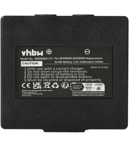 vhbw - the clever way - Batterie de rechange de haute qualité avec une grande autonomie et compatible avec votre telécommande industrielle (vous trouverez ci-dessous tous les modèles correspondants) - La batterie peut être chargée avec le chargeur standard ou un chargeur compatible - Nos batteries répondent à toutes les normes de sécurité actuelles CONTENU DE LIVRAISON : - 1x batterie DONNÉES TECHNIQUES : - Technologie : NiMH - Capacité : 2200 mAh - Tension : 3,6 V - Énergie nominale : 7,92 Wh - Couleur : noir - Hauteur : environ 2,1 mm - Nombre de cellules : 3 - Poids : 105 g - Dimensions (L x l x H) : 6 x 5,5 × 2,1 cm COMPATIBLE AVEC : - Hetronic Mini 68300990 - Hetronic Mini 68300940 Pour garantir la compatibilité, veuillez vérifier si votre batterie utilisée actuellement est répertoriée. REMPLACEMENT POUR : - EX2-22, KH68300990, 68300600, 68300900, 900, HE900, RHE3614KG, RHE3620KG vhbw - Accessoires et pièces de rechange de haute qualité pour prolonger la durée de vie de vos ...